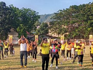 Sembari terus bergoyang dengan diiringi lagu, Ketua DPD Partai Golkar Beniyanto Tamoreka dan Ketua Panitia Pelaksana Senam Partai Golkar Panji Syahputra masuk dalam barisan senam.