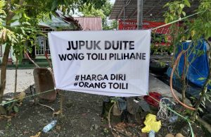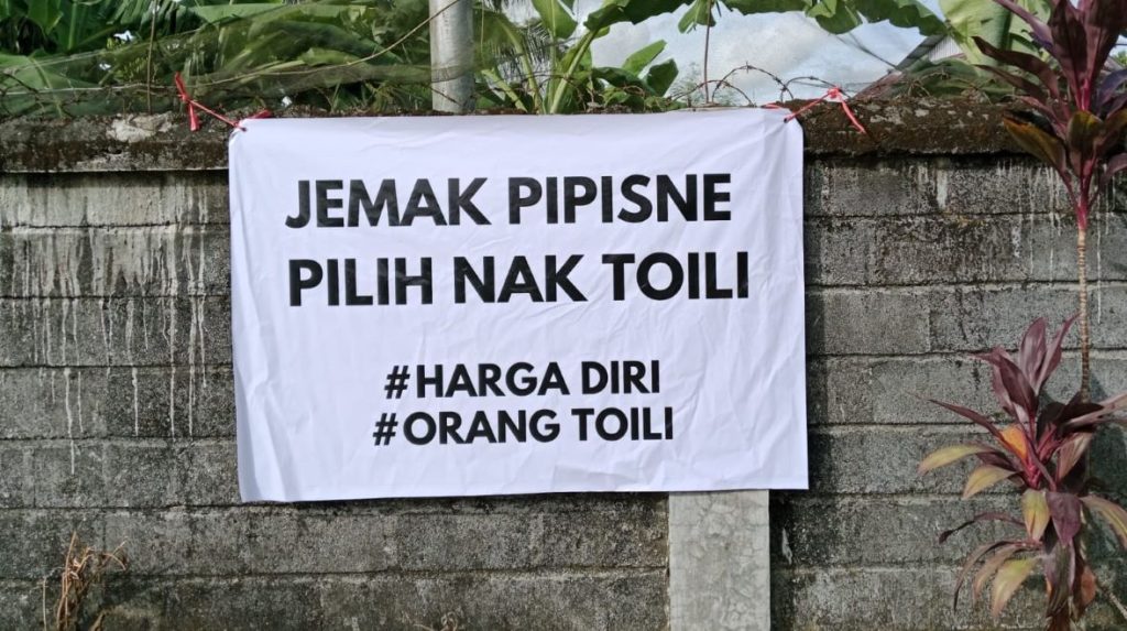 Spanduk kecil berwarna putih itu bertuliskan dalam dua bahasa, yakni Jawa dan Bali. “Jemak Pipisne Pilih Nak Toili” #Harga Diri #Orang Toili” (Bahasa Bali).
