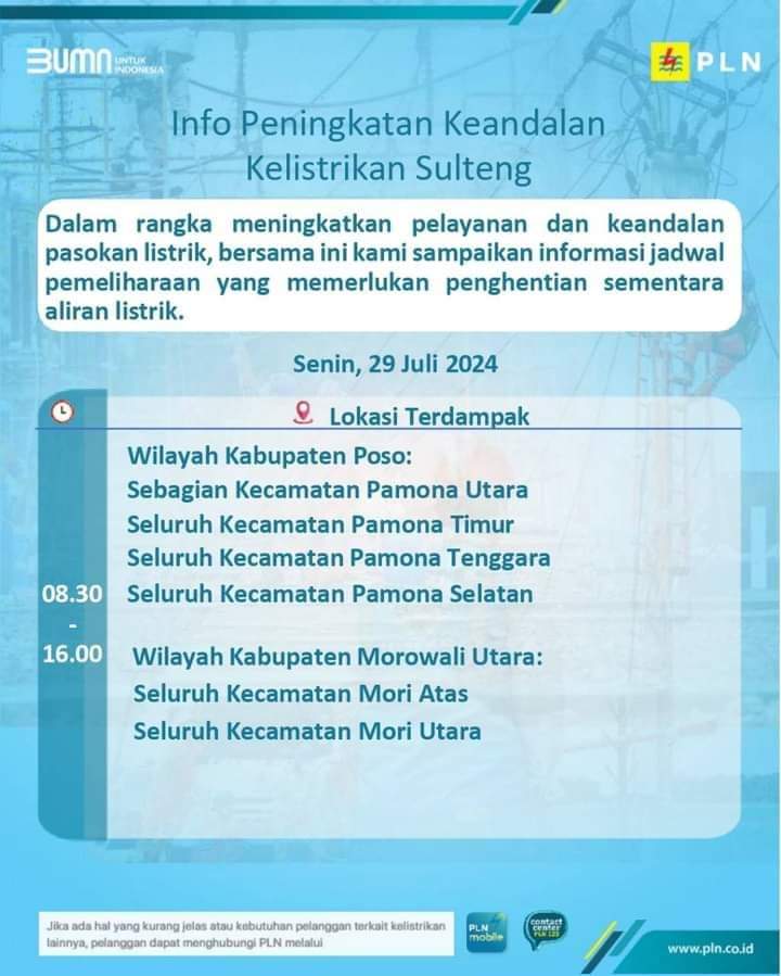 Morut, IN Dalam rangka meningkatkan pelayanan dan keandalan pasokan listrik, pihak PLN memberikan informasi jadwal pemeliharaan yang memerlukan penghentian sementara...